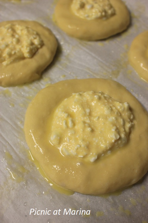 Roll puff pastry and cover the 9 inch pie dish, then cut the excess of the dough.